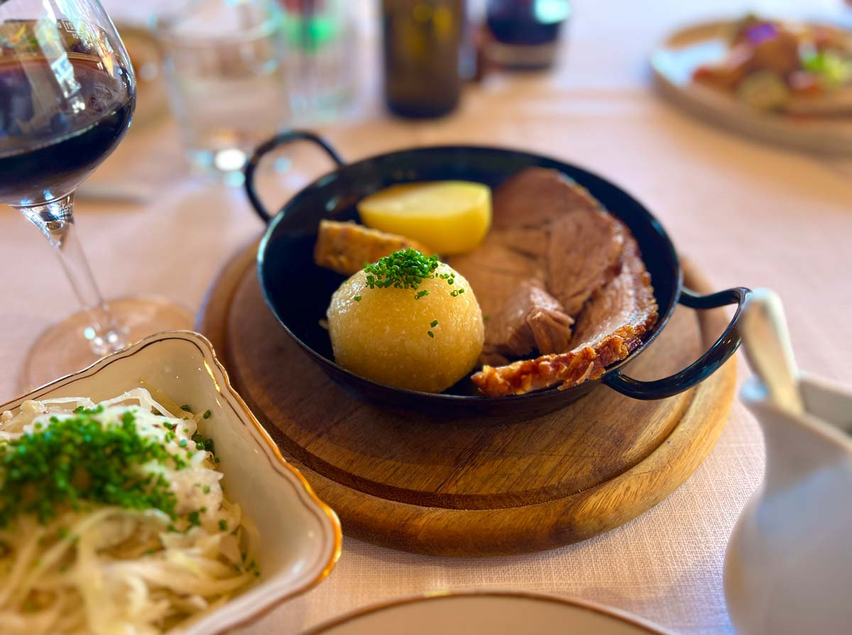 Moseralm Our journey continued to the Moseralm, a hilltop retreat where time slows down, and culinary traditions come alive. Known for the legendary Kistn Bratl, this delicacy features marinated organic pork shoulder and belly roasted over an open fire for hours until it melts in your mouth. The experience is elevated by carefully curated Austrian wines, regional beers, and homemade seasonal juices that perfectly accompany each dish. The Moseralm also offers a unique charm for equestrians, located at the heart of Europe’s largest interconnected riding network. With 700 kilometers of pristine trails, it's a paradise for horse lovers seeking adventure and serenity alike.
