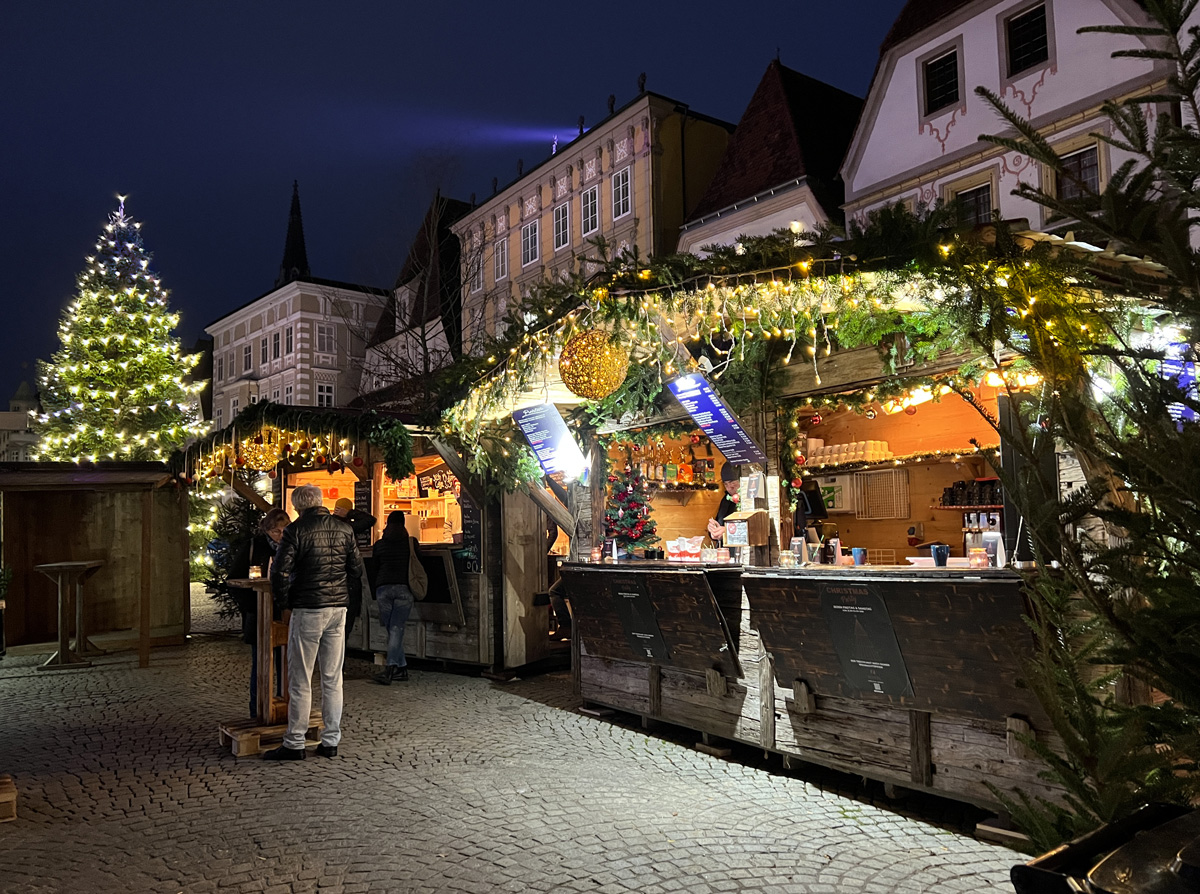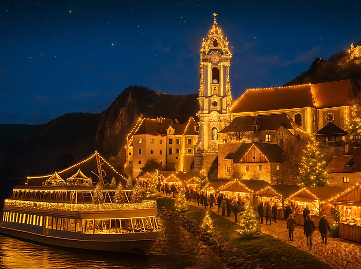And then the highlight: Austria’s first floating Advent market! A festively lit ship transforms into a tiny Christmas world with food, drinks, and unique exhibitors. The sparkle on the water plus the city lights make the Wachau Advent in Dürnstein simply unforgettable.