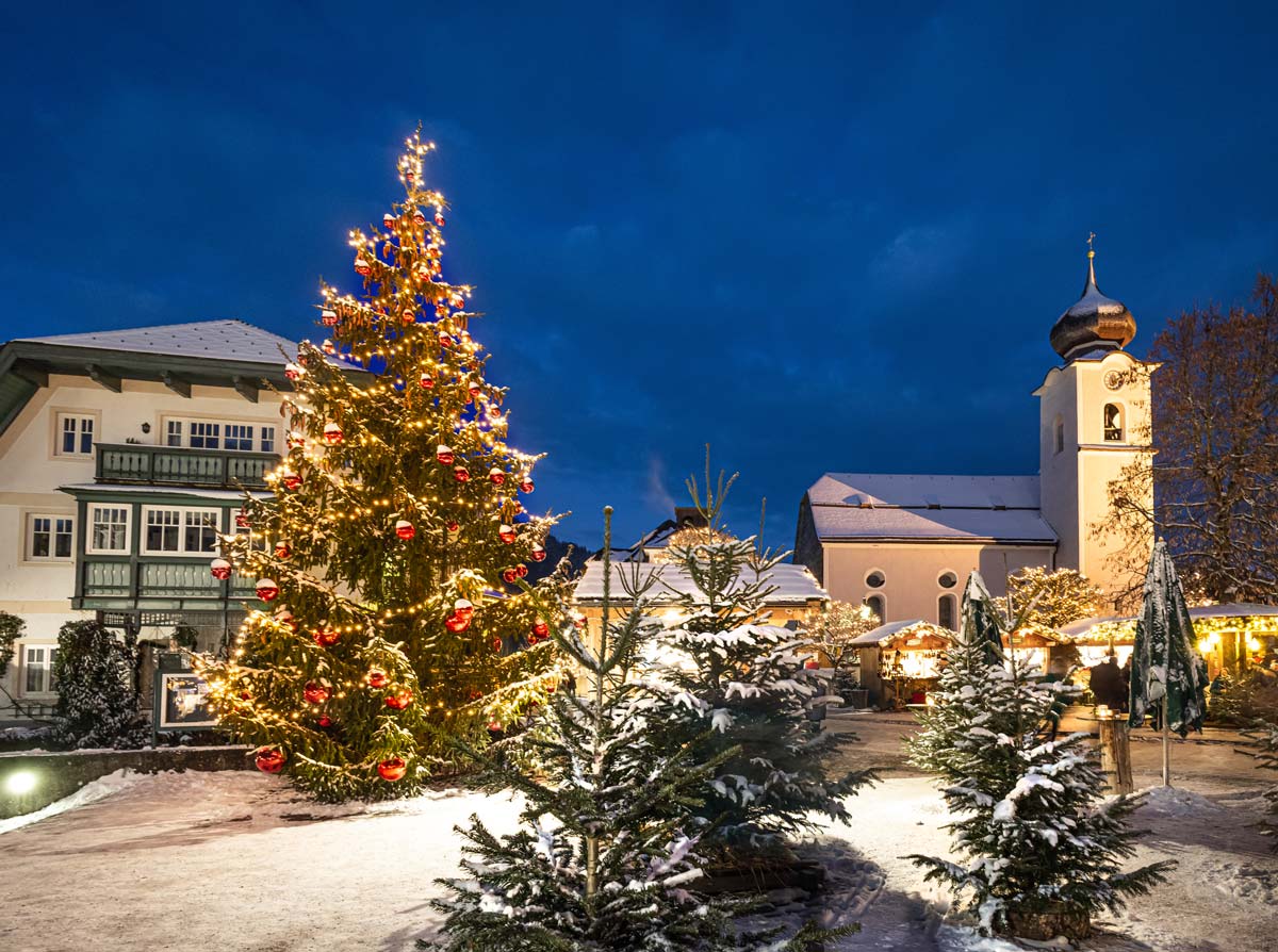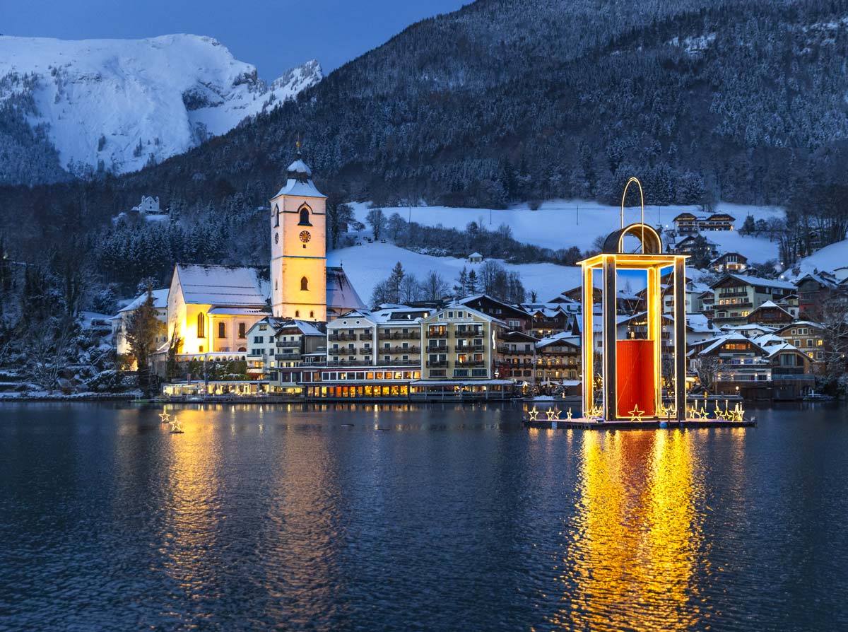 Stepping into St. Wolfgang in Advent feels like walking straight into a Christmas story. Two giant four-meter angels welcome you into the village, where candles, Christmas trees, and towering torches light up the narrow streets. And if you arrive by boat, you’ll spot the huge floating Light of Peace lantern glowing across the lake.