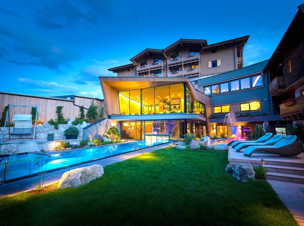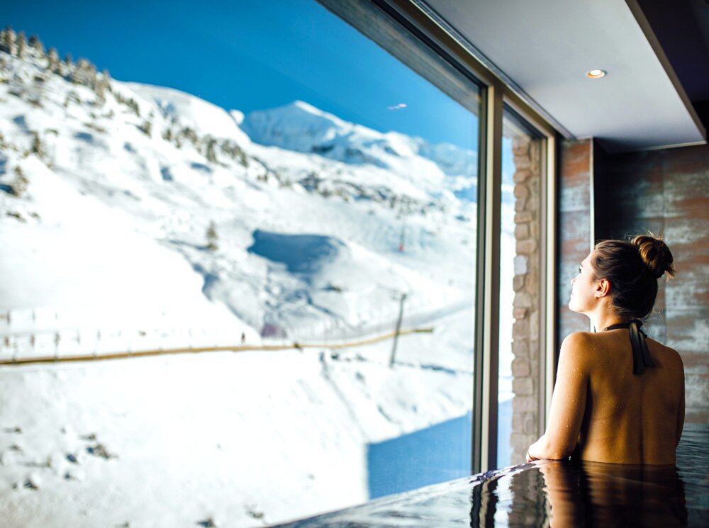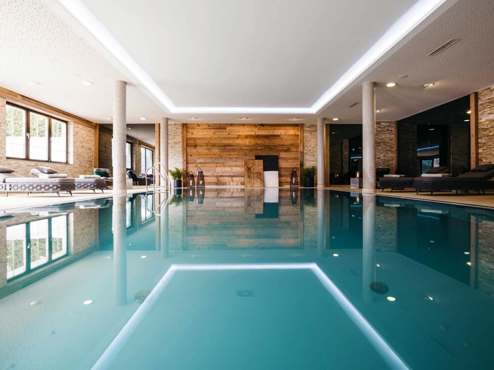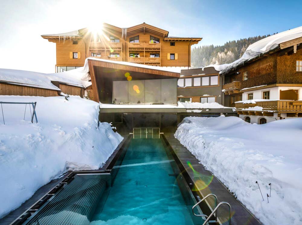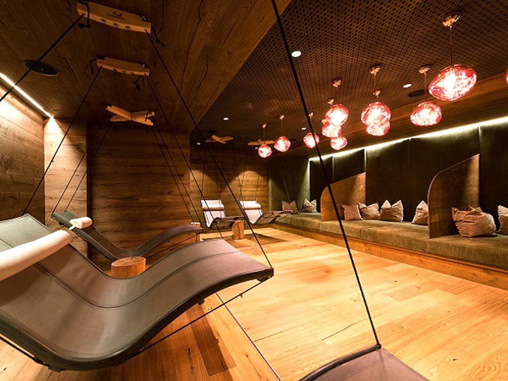 Die Riederalm, ist der perfekte Ausgangspunkt zum Skifahren, denn die Bergbahn befindet sich nur wenige Schritte vom Hotel entfernt. Das Hotel punktet aber auch mit zwei voneinander getrennten Wellnessbereichen, die architektonisch so raffiniert aufgeteilt wurden, dass Ruhesuchende und Kinder voll auf ihre Rechnung kommen. Im Mountain Spa gibt es einen 20 Meter langen Pool mit Panoramablick auf die Berge, der mit 33 Grad warmen Thermalwasser aus St. Martin gespeist wird. Für die Kleinen ist das Hallenbad mit einer riesigen Indoor- Wasserrutsche das nun-plus ultra.