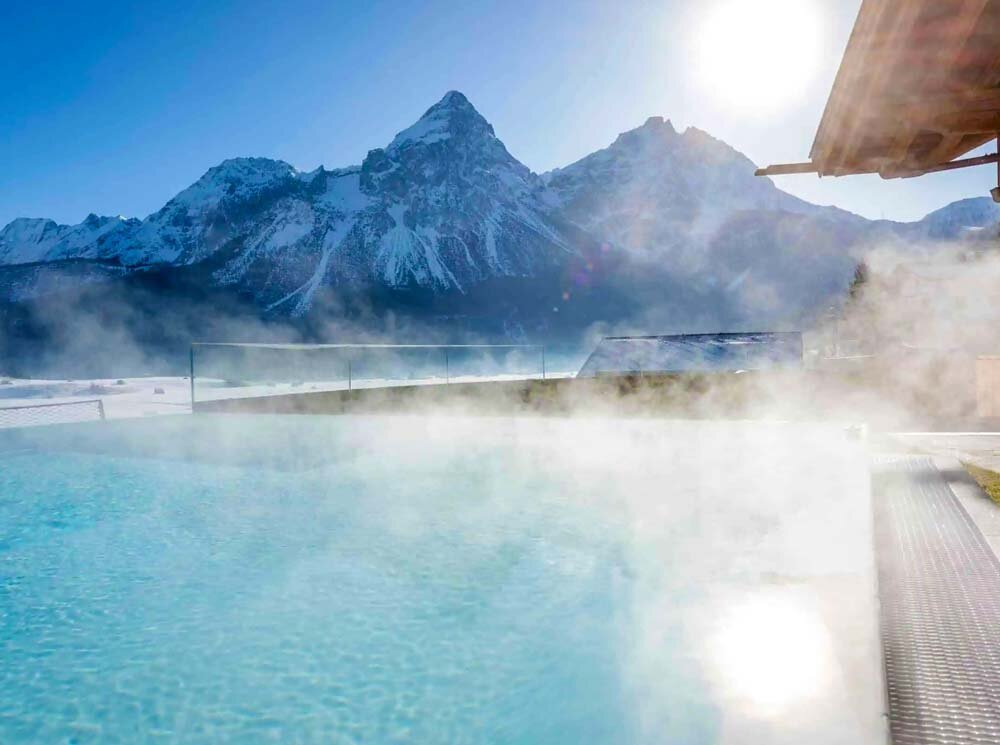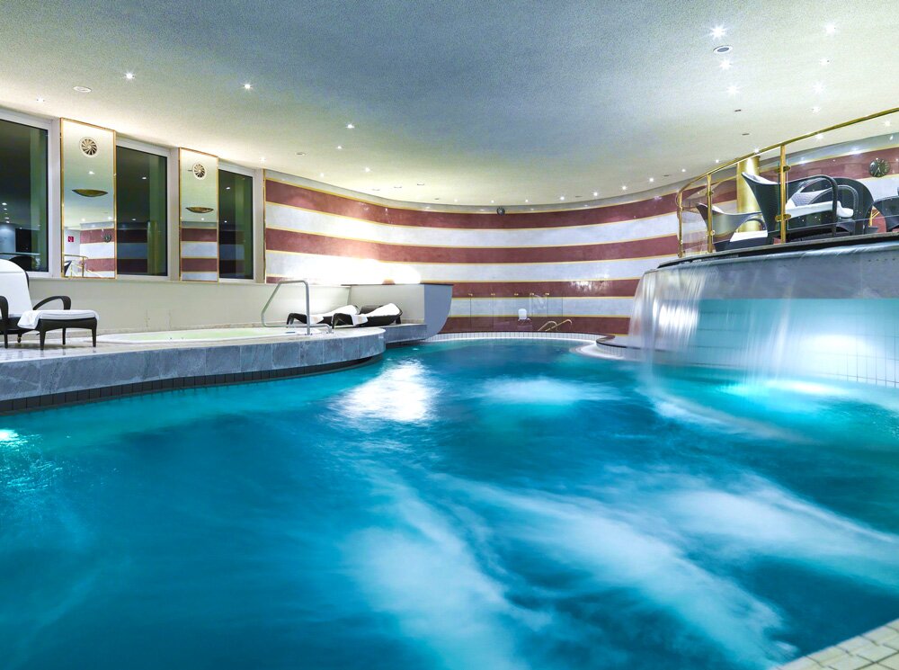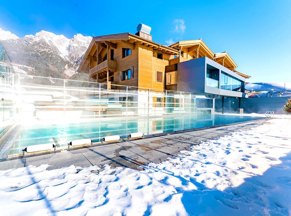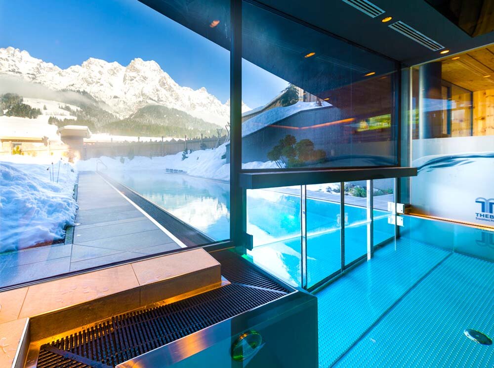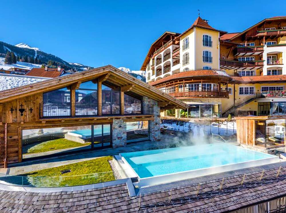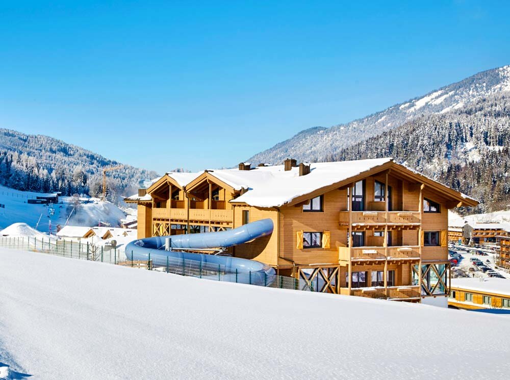 Die Riederalm, ist der perfekte Ausgangspunkt zum Skifahren, denn die Bergbahn befindet sich nur wenige Schritte vom Hotel entfernt. Das Hotel punktet aber auch mit zwei voneinander getrennten Wellnessbereichen, die architektonisch so raffiniert aufgeteilt wurden, dass Ruhesuchende und Kinder voll auf ihre Rechnung kommen. Im Mountain Spa gibt es einen 20 Meter langen Pool mit Panoramablick auf die Berge, der mit 33 Grad warmen Thermalwasser aus St. Martin gespeist wird. Für die Kleinen ist das Hallenbad mit einer riesigen Indoor- Wasserrutsche das nun-plus ultra.