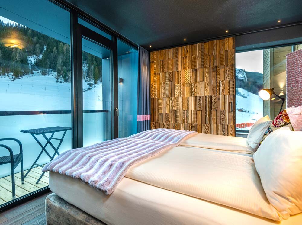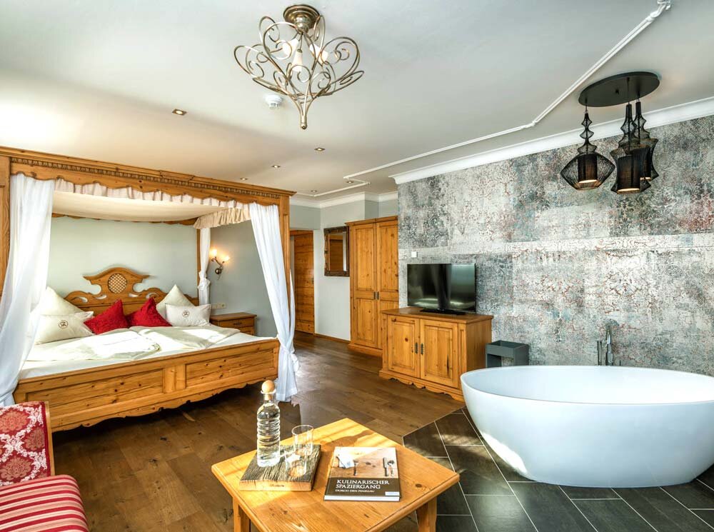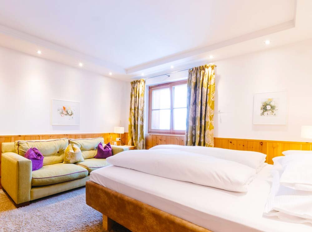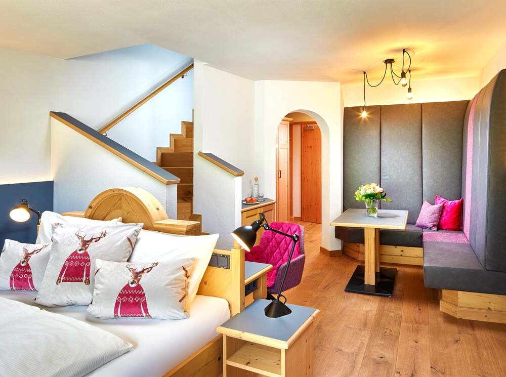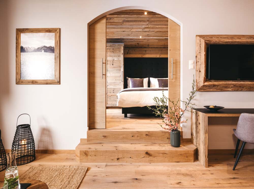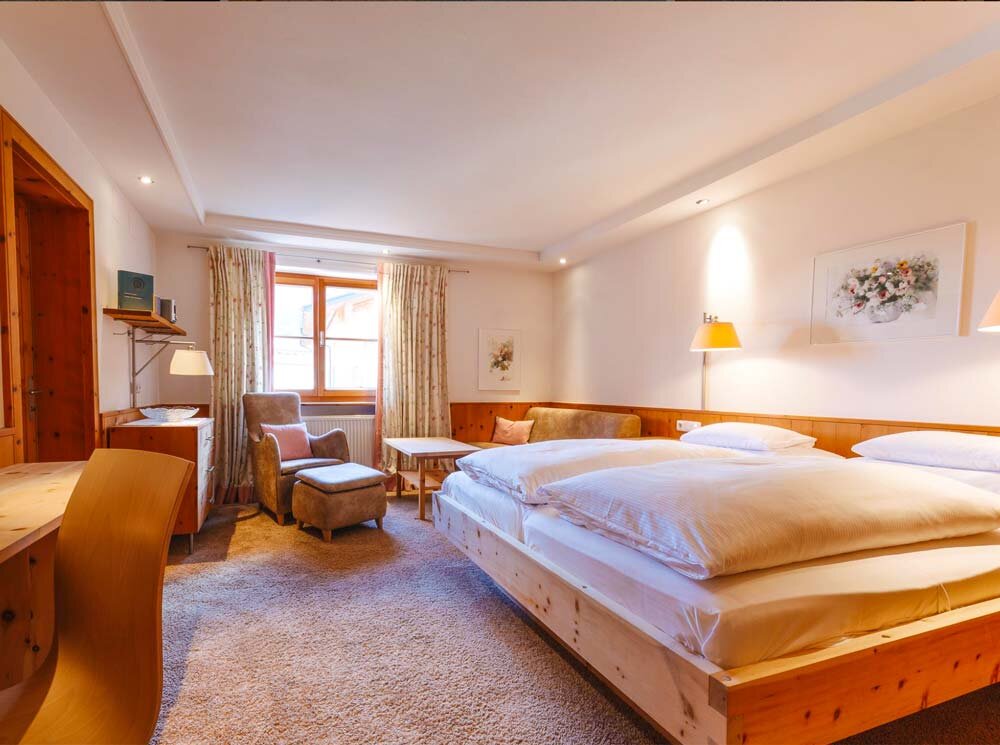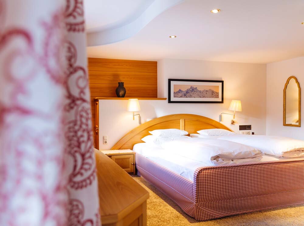 Gerade einmal 24 Zimmer, davon 7 Komfort-Doppelzimmer und 5 Appartements laden die Gäste hier zum Entspannen, Genießen und Wohlfühlen ein. Geschmackvoll eingerichtet, mit traditionellem Loden, kühlem Damast und einem Hauch von Zirbe in der Luft, wird das Zimmer zum Ruhepol eines jeden Aufenthaltes. Und mit dem Blick auf die Berge vom Bett aus steigt die Vorfreude auf einen Ski- oder Wandertag immer mehr.