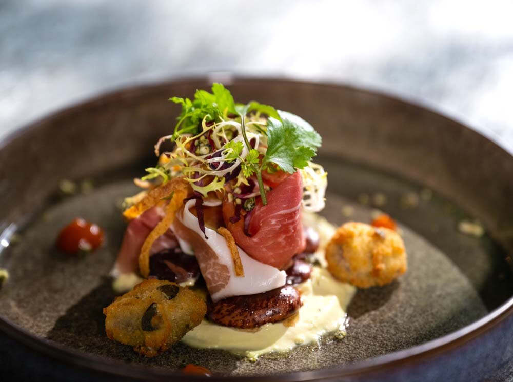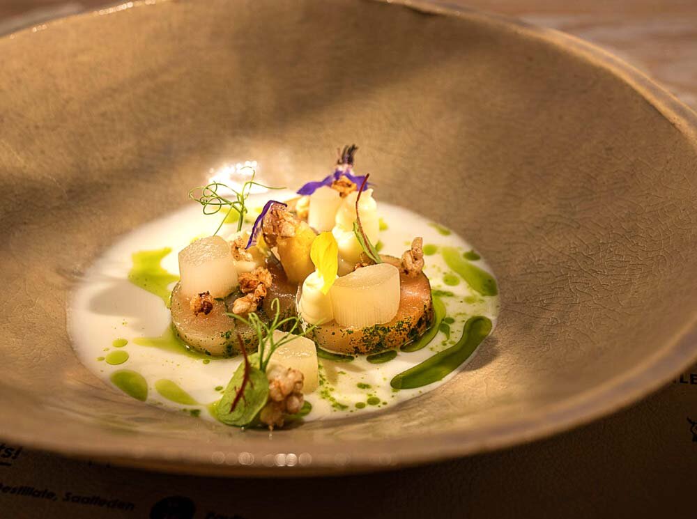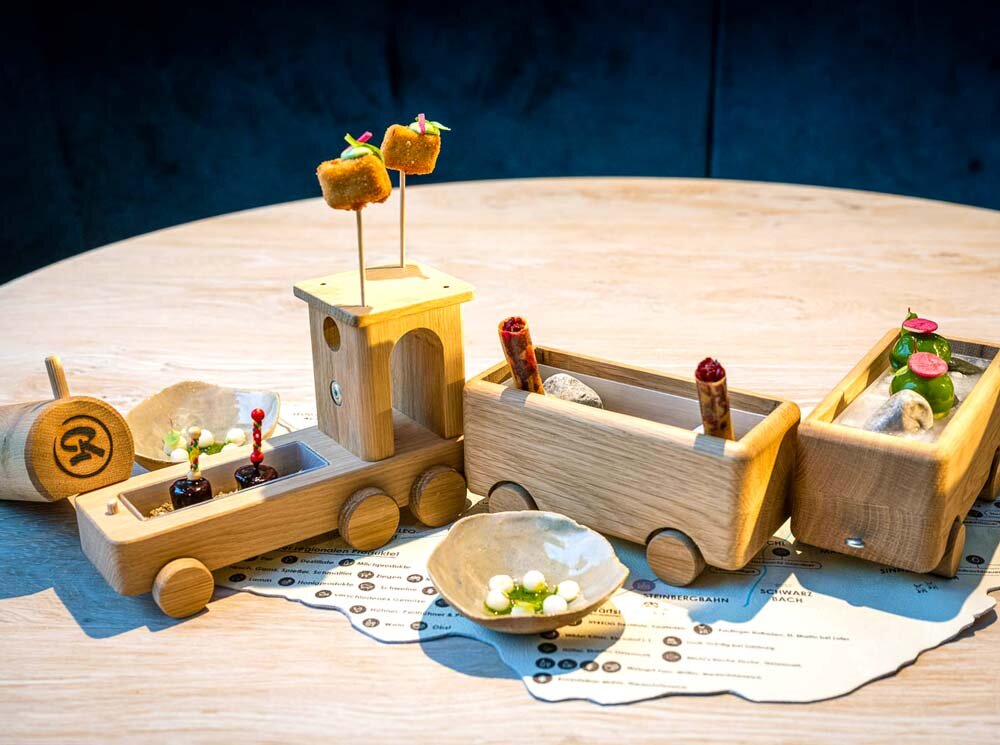 Ganz "dahoam" ist Küchenchef und Patron Andreas Herbst auch in seiner Küche, die regionalen Produzenten eine in jeder Hinsicht spektakuläre Bühne bietet. Das kulinarische Erlebnis startet schon mit einer etwas anderen Speisekarte: Symbole auf einer Karte auf weißem Stierleder widerspiegeln das feine Netzwerk an speziell ausgewählten, heimischen Manufakturen und bäuerlichen Betrieben, deren beste Produkte das Menü bestimmen.
