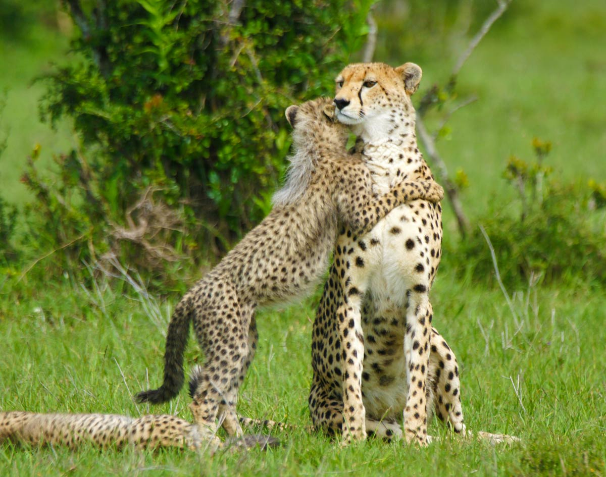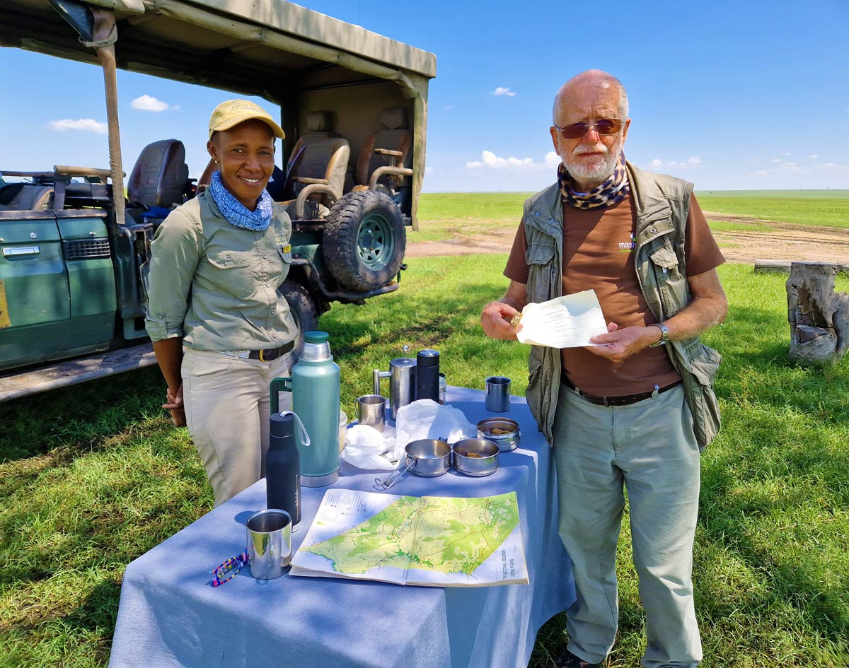 Unser letztes Ziel, das Mara Plains Camp, liegt unmittelbar am Ntiakitiak-Fluß, ebenfalls im Olare Motorogi Conservancy. Es war das erste Camp der Great Plains in Kenya und ist wahrscheinlich auch das Großzügigste. Es verfügt ebenfalls nur über sechs Zelte. Unseres schätzen wir auf nahezu siebzig Quadratmeter ein. Leider haben wir keine Zeit, die Kupferbadewanne auszuprobieren. Dafür treffen wir Beverly und Derek Joubert, die gerade ebenfalls hier wohnen und arbeiten. Am Abend erzählt mir Derek bei einem Gin Tonic am Lagerfeuer seine Geschichte: Von seinen Camps in Botswana, Simbabwe und von seinen Plänen in Kenia und Tansania. Beverly plaudert inzwischen unbefangen mit weiteren Gästen des Camps. Am nächsten Tag dürfen wir die beiden zu einer Gepardin begleiten, die vier Junge führt. Es ist ein schönes Erlebnis, die beiden bei ihrer Arbeit mit Filmkamera und einem Riesen-Teleobjektiv zu beobachten. Die Zeit vergeht wie im Flug, jagende Löwenrudel, ein Leopardenweibchen im Baum und nächtliche Flußpferdlaute direkt neben dem Zelt. Auf den Pirschfahrten eröffnet sich weiterer praktischer Komfort: Auf der Frühpirsch liegen Thermosflaschen auf den Sitzen, es gibt Regenponchos für Schlechtwetter, Schutzbrillen bei Insektenplage und Alu-Trinkwasserflaschen, die man mit nach Hause mitnehmen darf.