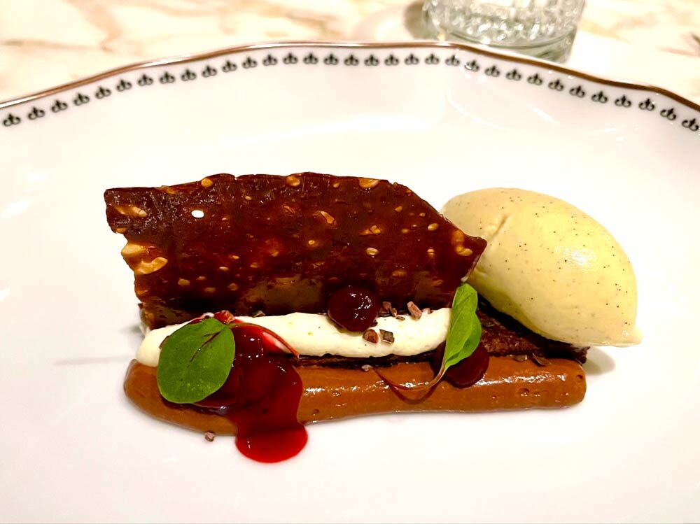 The 200-gram steak is perfectly grilled, tender, and pink and the mashed potatoes that come with it are no less delicious, and the French fries are crispy. The Goulash with butter dumplings was quite pleasant. In conclusion, the chocolate sour cherry Valhrona with vanilla ice cream and the pancakes with Wachau apricot jam were exquisite.