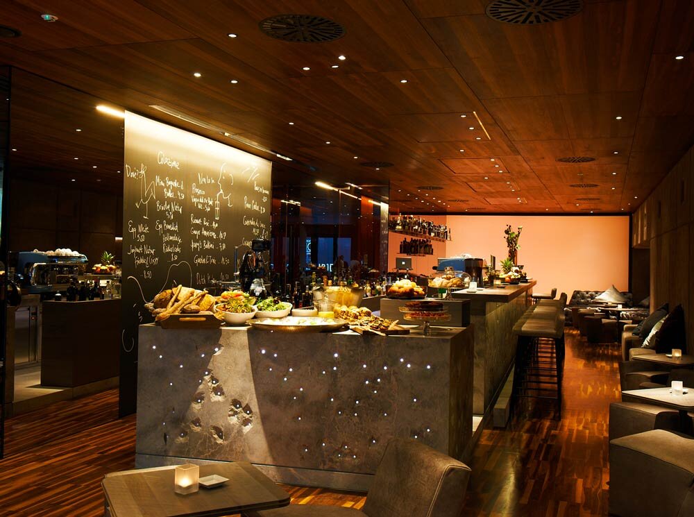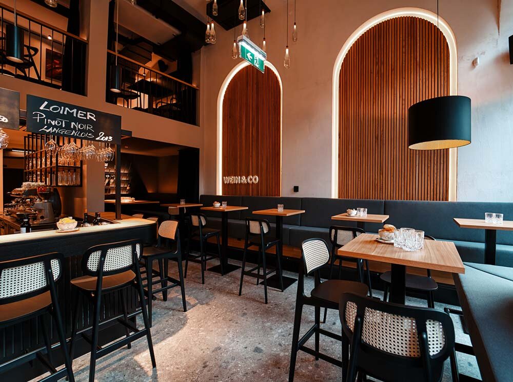 In addition to architectural highlights such as the extravagant light feature from 80 Burgundy bottle lamps on the gallery ceiling, Wein & Co also offers a unique service with the shop = wine menu concept. With over 35 top wines by the glass and over 1,500 bottled wines, guests can look forward to “Austria’s largest wine menu”.