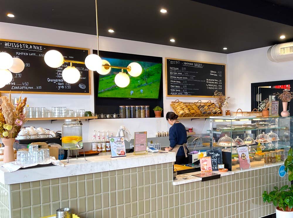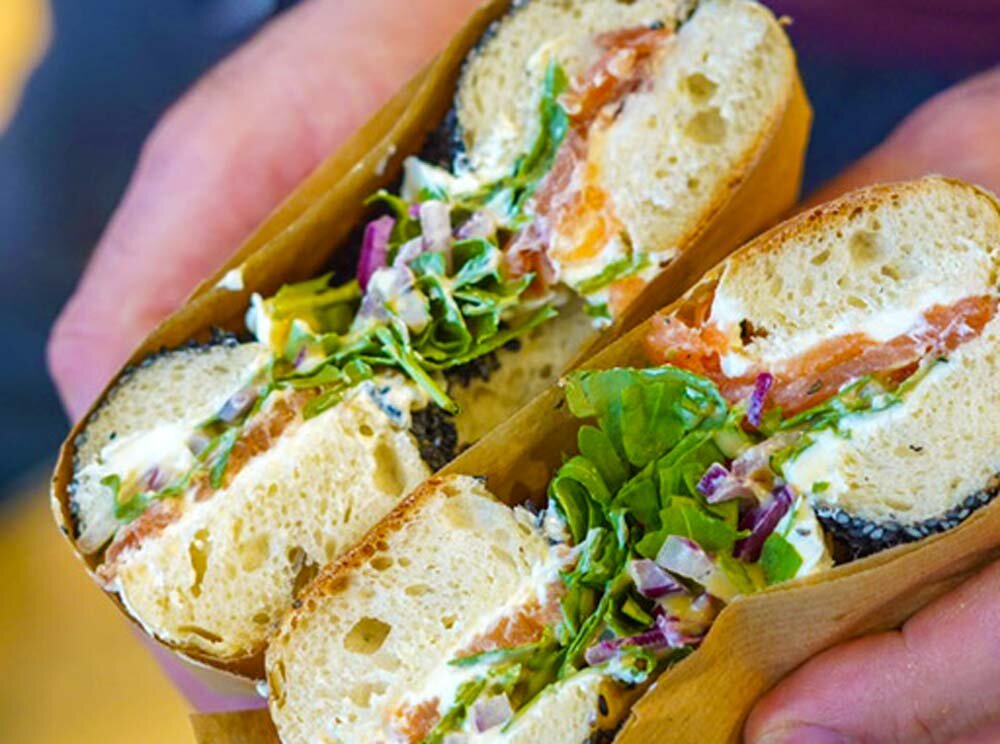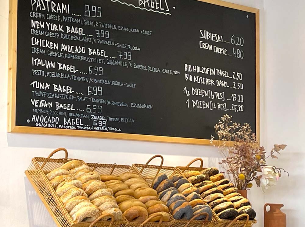 At Bagels and More located at Webgasse 43 in Vienna's 6th district, you can find the most delicious handmade bagels with various fillings. The most popular ones include basil pesto, mozzarella, tomatoes, arugula, and red onions, tuna spread, tomatoes, arugula, red onions, and pickles, or cream cheese and lox with arugula and red onions. Additionally, they serve homemade pastries like chocolate cake or cottage cheesecake for a delightful café experience.