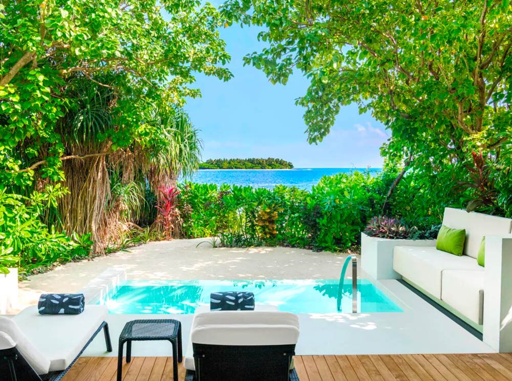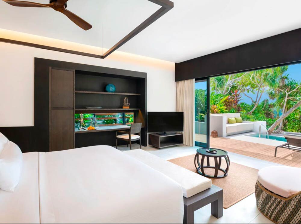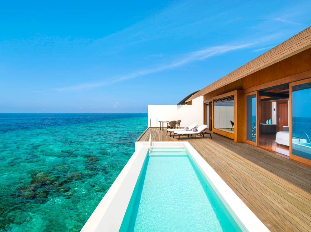 The beach villas with private pool are situated along the palm-fringed shores with direct access to the beach, the spacious overwater villas all have private pools and far-reaching ocean views.